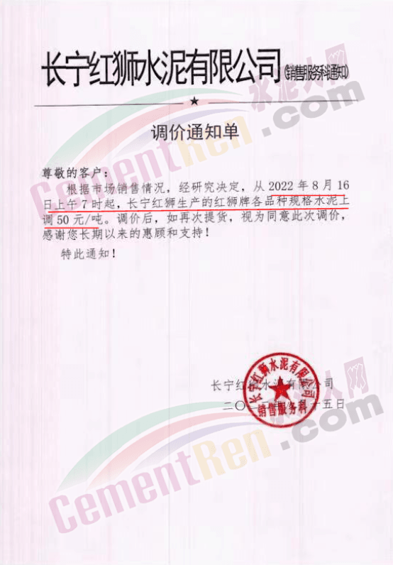 長寧紅獅水泥有限公司銷售服務(wù)科通知根據(jù)市場銷售情況,經(jīng)研究決定,從2022年8月16日上午7時起,長寧紅獅生產(chǎn)的紅獅牌各品種規(guī)格水泥上調(diào)50元/噸。調(diào)價后,如再次提貨,視為同意此次調(diào)價。