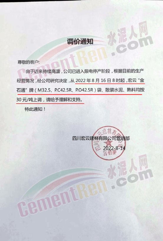 四川宏云建材有限公司營銷部通知,由于近期持續(xù)高溫,公司已進入限電停產(chǎn)階段,根據(jù)目前的生產(chǎn)經(jīng)營情況,經(jīng)公司研究決定,從8月16日起,宏云“金石通”牌袋散裝水泥、熟料均按30元/噸上調(diào)。