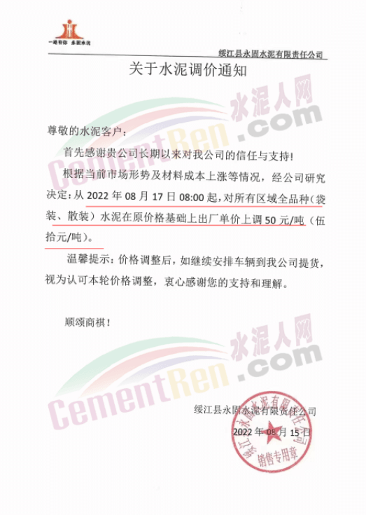 綏江永固水泥有限責(zé)任公司通知,從2022年08月17日08:00起,對所有區(qū)域全品種(袋裝、散裝)水泥在原價格基礎(chǔ)上出廠單價上調(diào)50元/噸。