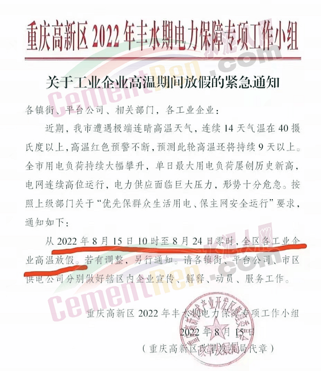 重慶高新區(qū)發(fā)布《關(guān)于工業(yè)企業(yè)高溫期間放假的緊急通知》稱,近期,重慶市遭遇極端連晴高溫天氣,連續(xù)14天氣溫在40攝氏度以上,高溫紅色預(yù)警不斷,預(yù)測此輪高溫還將持續(xù)9天以上。全市用電負荷持續(xù)大幅攀升,單日最大用電負荷屢創(chuàng)歷史新高。電網(wǎng)連續(xù)高位運行,電力供應(yīng)面臨巨大壓力,形勢十分危急。按照上級部門關(guān)于“優(yōu)先保群眾生活用電、保主網(wǎng)安全運行"要求,通知從2022年8月15日10時至8月24日零時,全區(qū)各工業(yè)企業(yè)高溫放假。若有調(diào)整,另行通知。