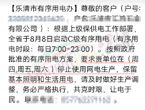 8月初,浙江省發(fā)改委發(fā)布《關(guān)于同意啟動C級有序用電的函》給國網(wǎng)浙江電力有限公司稱,經(jīng)請示省政府同意,浙江省8月8日根據(jù)用電缺口實際情況啟動C級1250萬千瓦有序用電措施,8月9日再視情況調(diào)整有序用電等級。請認真做好有序用電細化措施,壓實各地責(zé)任,確保民生用電,絕不能拉閘限電。