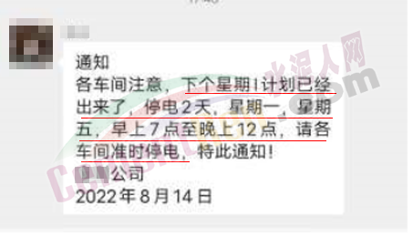 區(qū)域內(nèi)一家水泥企業(yè)緊急通知,因近期確保民生用電,導(dǎo)致水泥廠錯峰停電無法正常生產(chǎn)水泥,特此通知!從2022年8月16日00:00起所有水泥在原有基礎(chǔ)上上調(diào)50元/噸。同時水泥廠裝貨較為困難(無法磨熟料),預(yù)計散裝預(yù)計進廠排隊等待時間大于20小時(無法確是否能裝到),為保證前場供給,麻煩各位客戶一定要合理安排,預(yù)估送貨時間及前場水泥使用情況,避免不必要的斷料。該情況預(yù)計需要一周以后才能根據(jù)供電量情況是否有所好轉(zhuǎn)。
