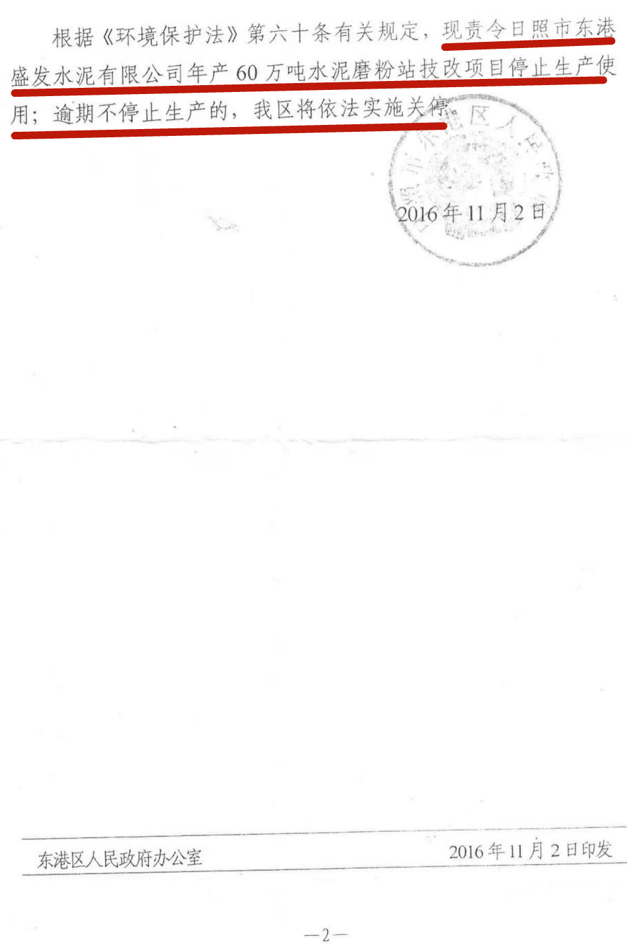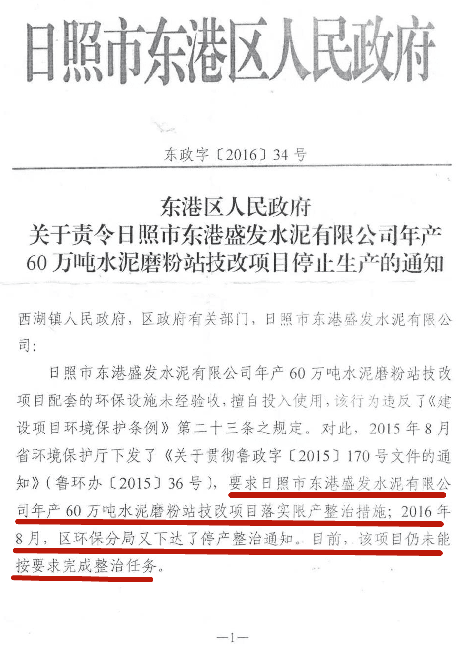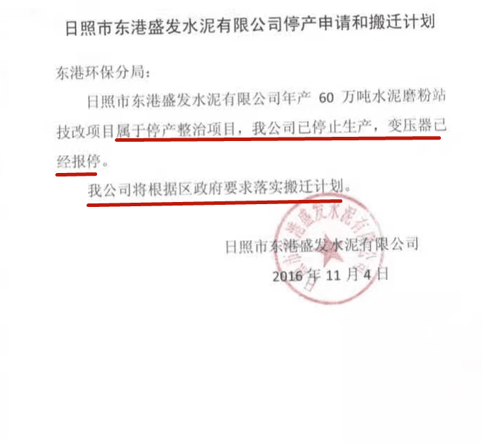 倒推時(shí)間軸,政府文件為證,2016年11月2號(hào)日照市東港區(qū)政府責(zé)令盛發(fā)停止生產(chǎn)的通知,11月4號(hào)企業(yè)上報(bào)區(qū)環(huán)保分局,明確:我公司將根據(jù)區(qū)政府要求落實(shí)搬遷計(jì)劃。