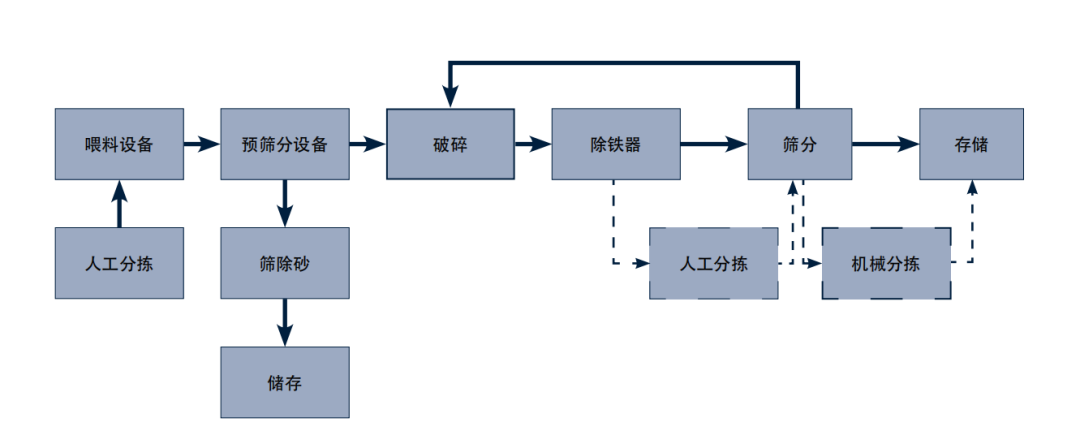 而建筑垃圾本身可以作為砂石骨料生產(chǎn)的半成品直接進(jìn)行利用,簡(jiǎn)單來(lái)講,要想將建筑垃圾在建材產(chǎn)業(yè)鏈中變廢為寶,只需做好“篩分+破碎”這兩大工序即可。