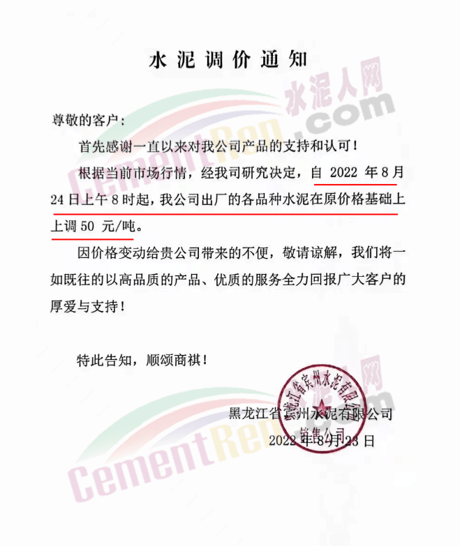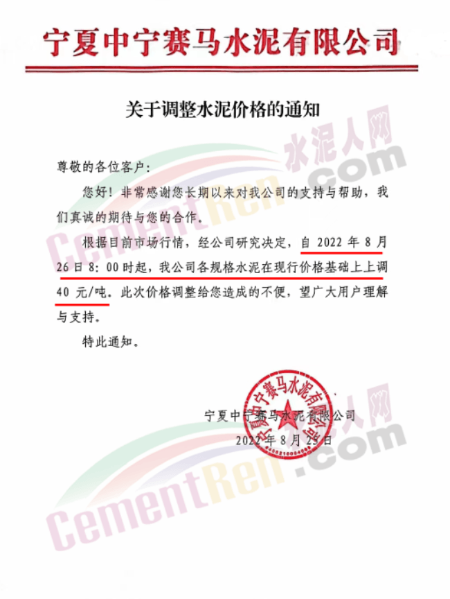 寧夏石嘴山賽馬水泥有限責任公司通知8月27日8時起,各品種水泥銷售價格上調60元/噸。
