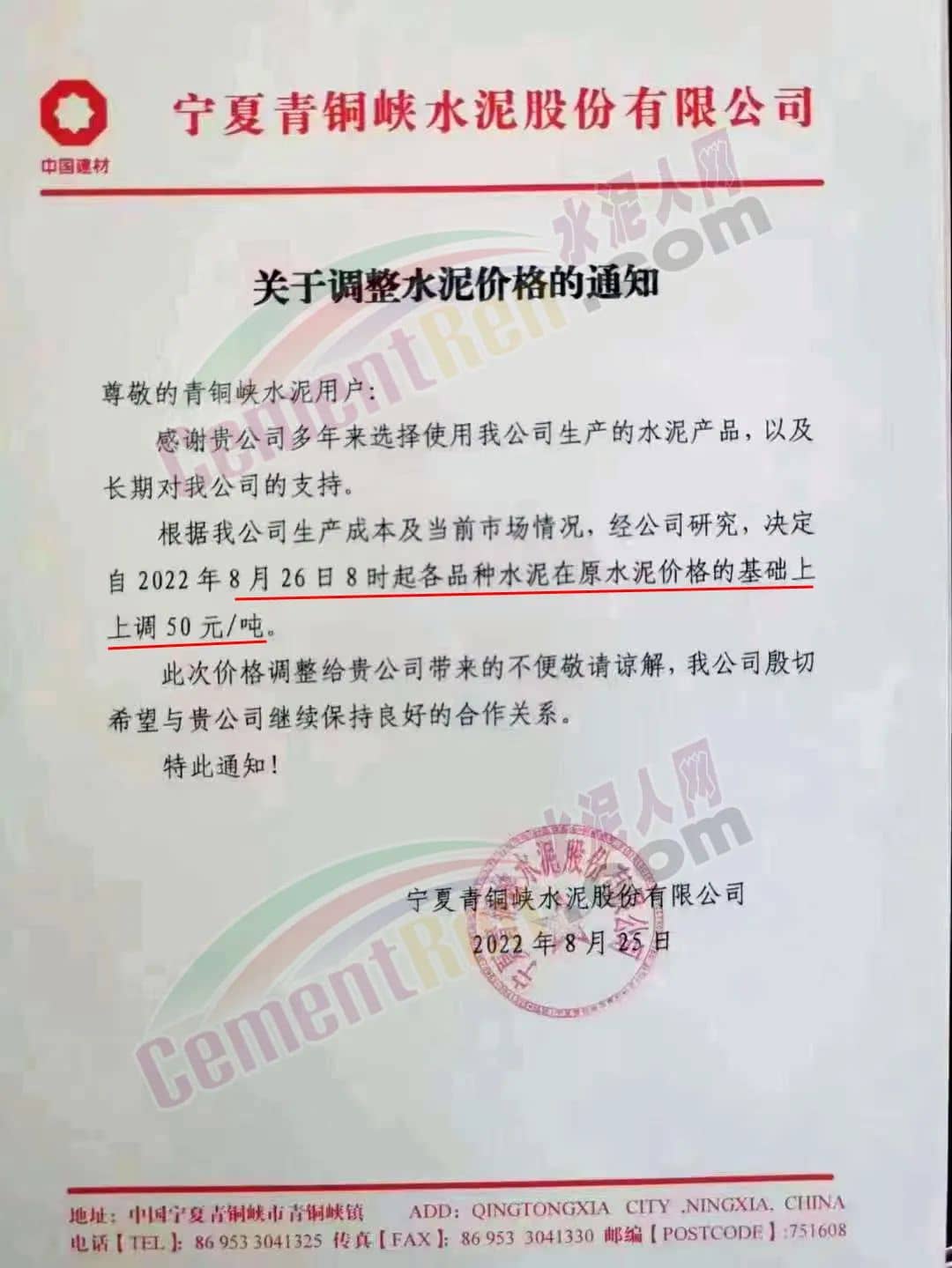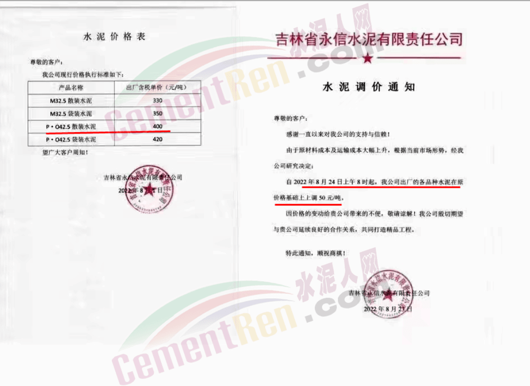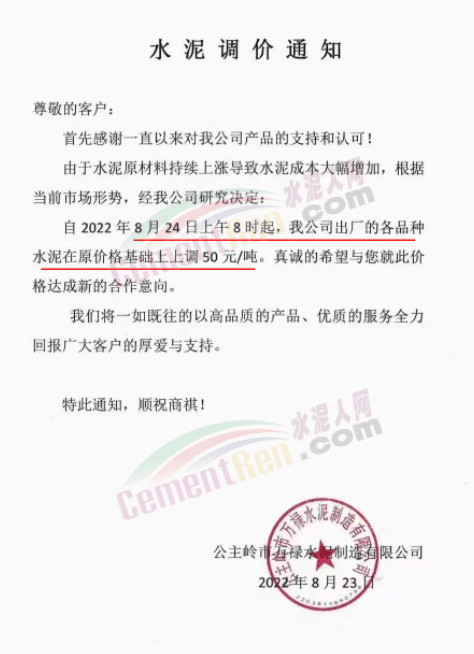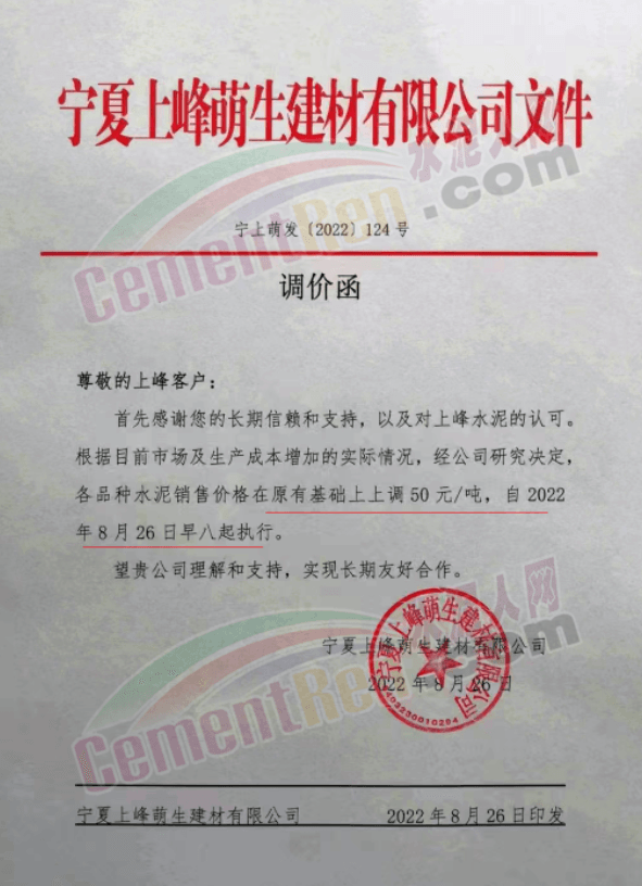 寧夏上峰萌生建材有限公司通知各品種水泥價格自8月26日早8時起在原有基礎上上調50元/噸。