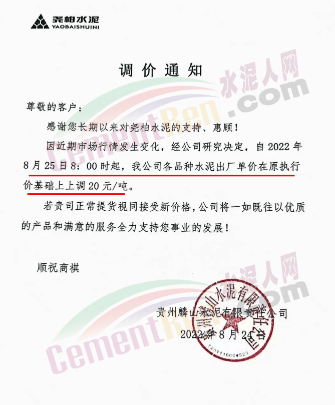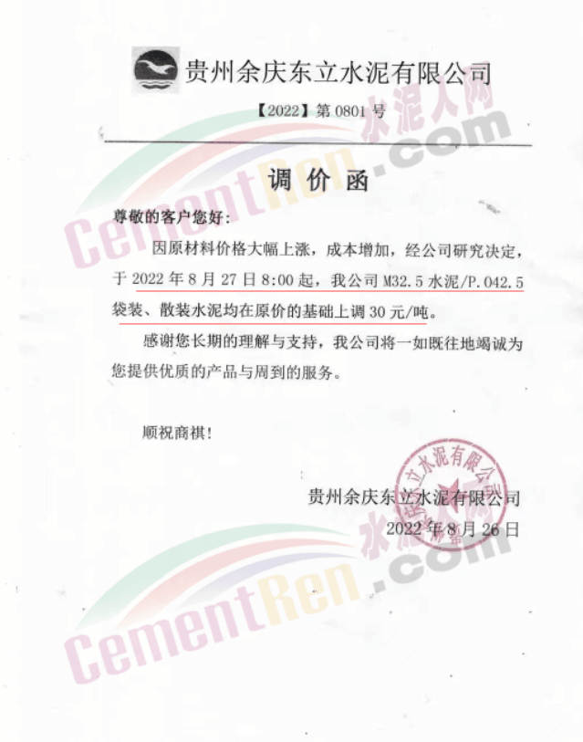 貴州余慶東立水泥通知,自8月27日8時起,公司多品牌水泥在原價基礎上上調30元/噸。