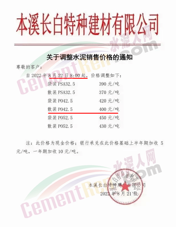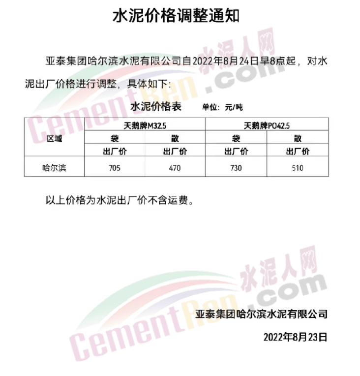 梅州市塔牌營銷有限公司通知自8月27日零時起,惠塔公司所有袋裝P.O42.5R及以上強度等級水泥出廠結算價格分別在現(xiàn)行價格基礎上上調20元/噸。