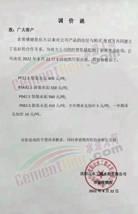 因不可抗力原因,企業(yè)停產。川渝區(qū)域主要品牌企業(yè)西南水泥、金隅冀東、雙馬水泥等繼前期18日-20日推漲50-60元/噸后,再次通知于8月23日-24上調水泥價格50元/噸。