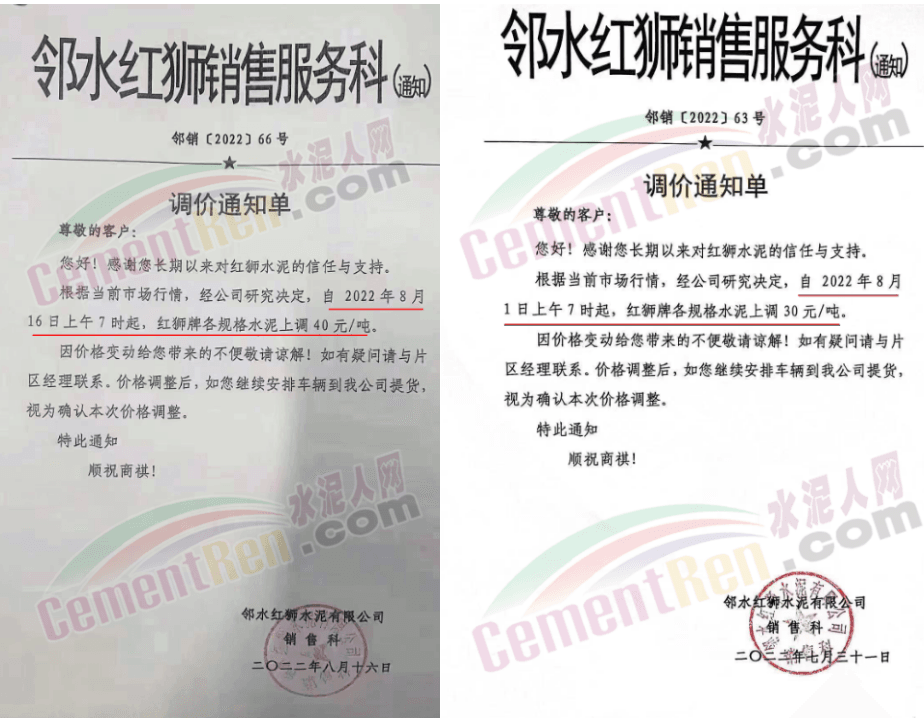 鄰水紅獅銷售服務科通知,紅獅牌各規(guī)格水泥分別于8月1日漲30元/噸、16日漲40元/噸、18日漲60元/噸、23日漲50元/噸,4次累計上漲達180元/噸。