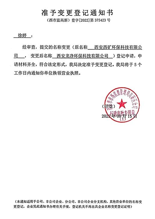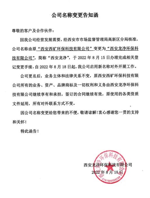 因企業(yè)經(jīng)營發(fā)展需要,經(jīng)西安市市場監(jiān)督管理局高新區(qū)分局核準(zhǔn),企業(yè)名稱由原“西安西礦環(huán)??萍加邢薰?rdquo;變更為“西安龍凈環(huán)保科技有限公司”,簡稱“西安龍凈”,于2022年8月15日辦理完成相關(guān)登記變更手續(xù),自2022年8月18日起,企業(yè)啟用新名稱對外開展工作。