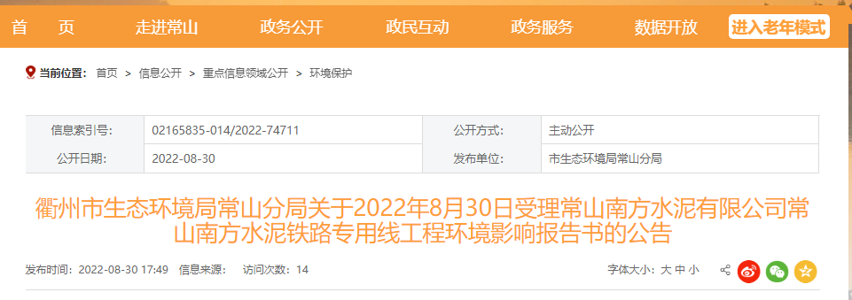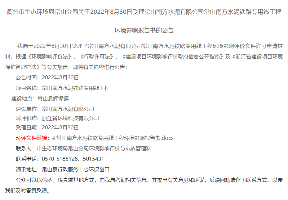 浙江省衢州市生態(tài)環(huán)境局常山分局發(fā)布《關于2022年8月30日受理常山南方水泥有限公司常山南方水泥鐵路專用線工程環(huán)境影響報告書的公告》