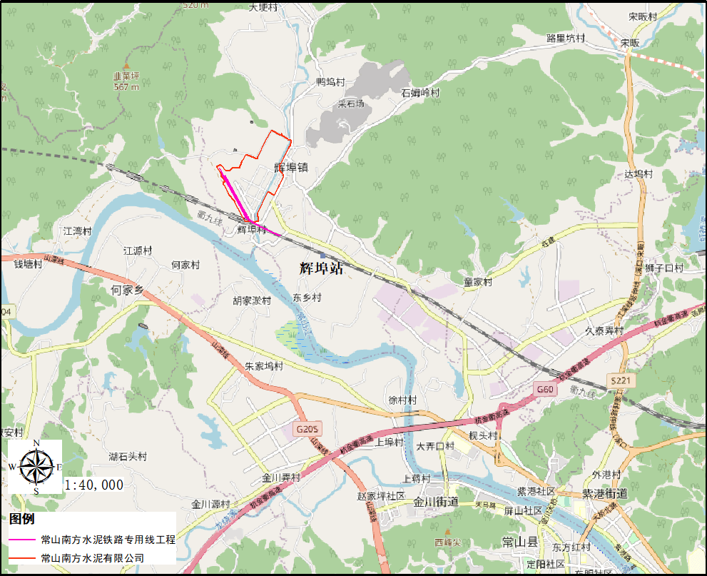 2022年5月19日,浙江省發(fā)展和改革委員會核準了本工程,項目名稱“常山南方水泥鐵路專用線工程”,項目代碼2205-330000-04-01-161771。本工程在現有鐵路九景衢鐵路的輝埠站九江端接軌,沿九景衢鐵路的北側向西布線至廠區(qū),全長約1.79km,采用專用線標準。輝埠站九江端約270m范圍調整軌道增設道岔,輝埠站與廠區(qū)之間約345m新建專用線,進廠后利用預留用地設廠區(qū)站。廠區(qū)站用于原煤卸車和水泥裝車。本專用線設計運量為170萬噸/年,本次專用線工程不改變廠區(qū)原有產能。