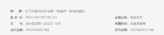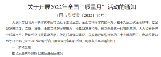 日前,國家市場監(jiān)管總局發(fā)布《關(guān)于開展2022年全國“質(zhì)量月”活動(dòng)的通知》(國市監(jiān)質(zhì)發(fā)〔2022〕76號(hào))提到,市場監(jiān)管總局等21個(gè)部門定于2022年9月聯(lián)合開展全國“質(zhì)量月”活動(dòng)?;顒?dòng)主題為“推動(dòng)質(zhì)量變革創(chuàng)新 促進(jìn)質(zhì)量強(qiáng)國建設(shè)”。