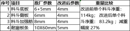 針對(duì)以上情況,建平華凱更換料斗材質(zhì),采用NM450 鋼板,徹底解決了磨損快、易變形等問(wèn)題,在保證使用性能和壽命的同時(shí),實(shí)現(xiàn)輕量化,降低運(yùn)行負(fù)荷,同時(shí)提高了鏈條壽命。改造后料斗的壽命是原來(lái)的 2-3 倍,料斗減重 27%以上,提升機(jī)運(yùn)行電流會(huì)有所降低,經(jīng)廠家實(shí)測(cè),理論計(jì)算在6%左右。