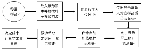 稱量一定量的樣品,將其倒入150ml錐形瓶中,加上30ml的乙二醇-無水乙醇溶液,放入攪拌子,然后放入儀器中對應(yīng)位置,裝上冷凝管,使得錐形瓶與冷凝管緊密連接,在儀器顯示屏對應(yīng)的位置輸入稱取的樣品質(zhì)量及樣品名稱,點擊開始測量,儀器會自動進行攪拌、加熱、萃取、滴定及結(jié)果計算,如圖2。