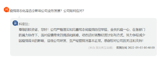 深圳從事軌道交通產(chǎn)品研發(fā)、生產(chǎn)、銷售的科安達(dá)回復(fù)公司嚴(yán)格落實(shí)和完善常態(tài)化疫情防控舉措,全員抗疫一心,在各部門的通力協(xié)作下,面對疫情帶來的挑戰(zhàn)和困難,動態(tài)適時(shí)調(diào)整經(jīng)營計(jì)劃與方式,努力爭取減少因疫情帶來的影響,目前公司研發(fā)、生產(chǎn)經(jīng)營情況基本正常。