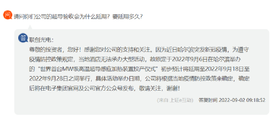 聯(lián)創(chuàng)光電回復(fù),因?yàn)榻展枮I突發(fā)新冠疫情,為遵守疫情防控政策規(guī)定,當(dāng)?shù)鼐频隉o法承辦大型活動,故原定于2022年9月6日在哈爾濱舉辦的“世界首臺MW級高溫超導(dǎo)感應(yīng)加熱裝置投產(chǎn)儀式”初步預(yù)計(jì)將延期至2022年9月18日至2022年9月28日之間舉行,具體活動舉辦日期,公司將根據(jù)當(dāng)?shù)匾咔榉揽卣邅泶_定。