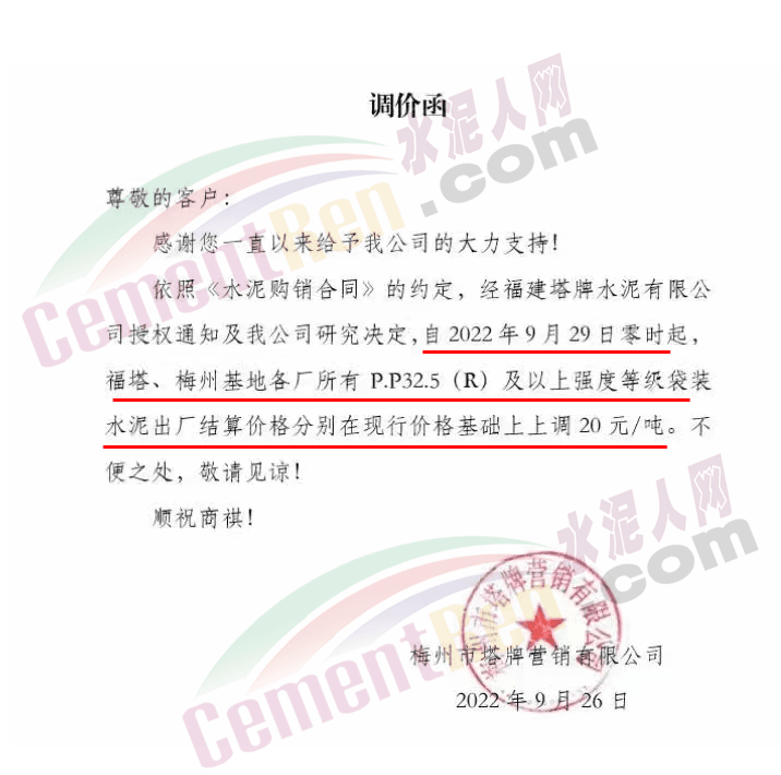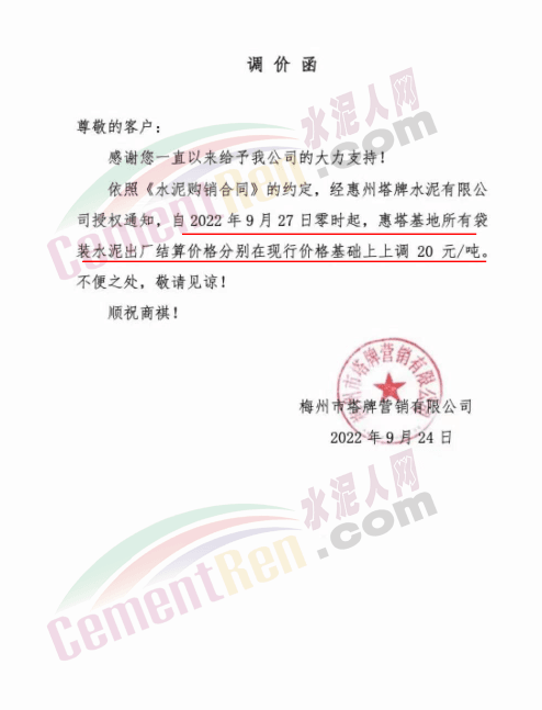 梅州市塔牌營銷有限公司自2022年9月29日零時(shí)起,福塔、梅州基地各廠所有PP325(R)及以上強(qiáng)度等級(jí)袋裝水泥出廠結(jié)算價(jià)格分別在現(xiàn)行價(jià)格基礎(chǔ)上上調(diào)20元/噸。