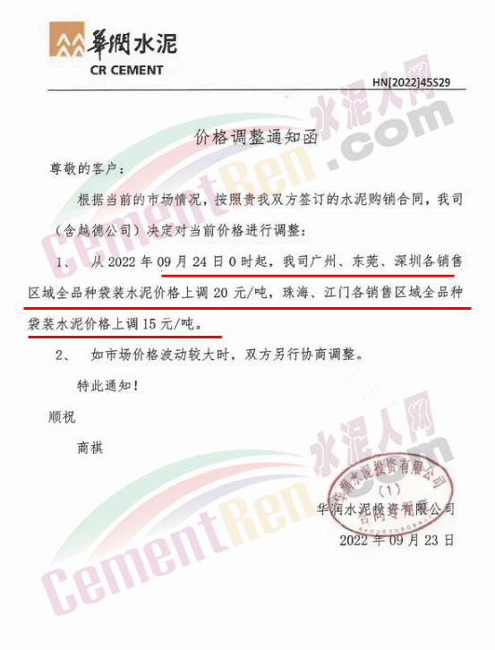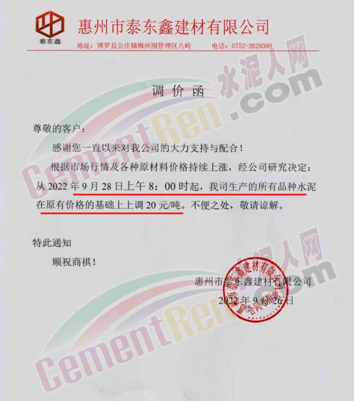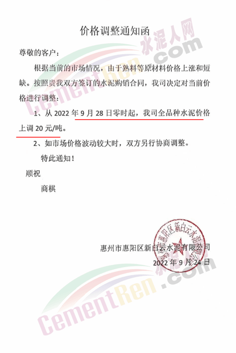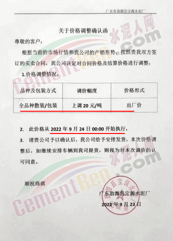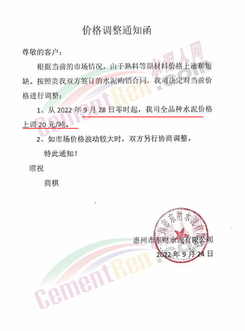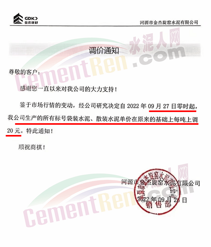 河源市金杰旋窯水泥有限公司通知鑒于市場行情的變動(dòng),經(jīng)公司研究決定自2022年09月27日零時(shí)起公司生產(chǎn)的所有標(biāo)號(hào)袋裝水泥、散裝水泥單價(jià)在原來的基礎(chǔ)上每噸上調(diào)20元。