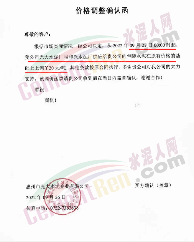 惠州市光大水泥企業(yè)有限公司通知,自9月27日0時(shí)起,水泥價(jià)格上調(diào)20元/噸。
