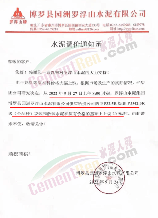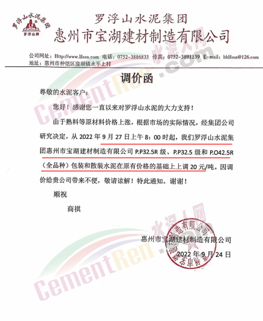 博羅縣園洲羅浮山水泥通知,9月27日8時(shí)起,水泥價(jià)格上調(diào)20元/噸。