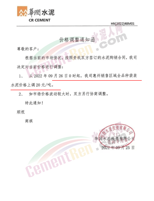 華潤水泥通知26日0時(shí)起,惠州區(qū)域全品種袋裝水泥上調(diào)20元/噸,24日起,廣州、東莞、深圳全品種袋裝水泥上調(diào)20元/噸,珠海、江門全品種袋裝水泥上調(diào)15元/噸。