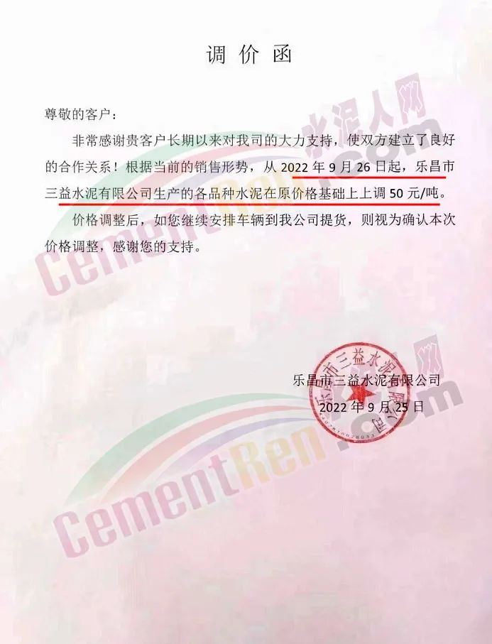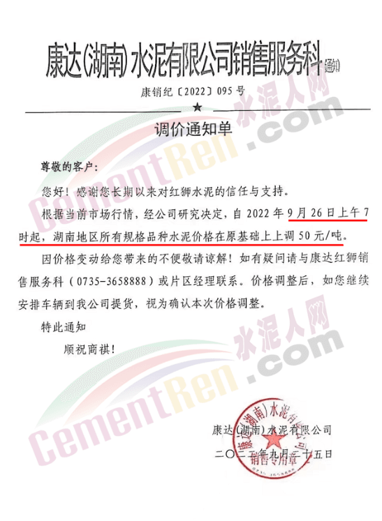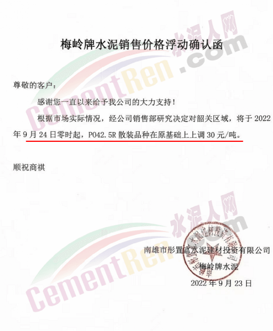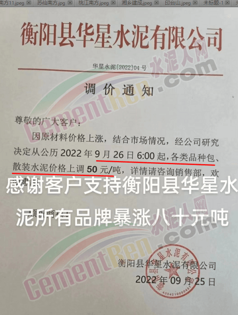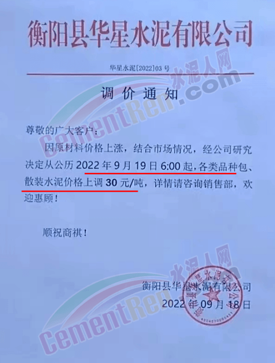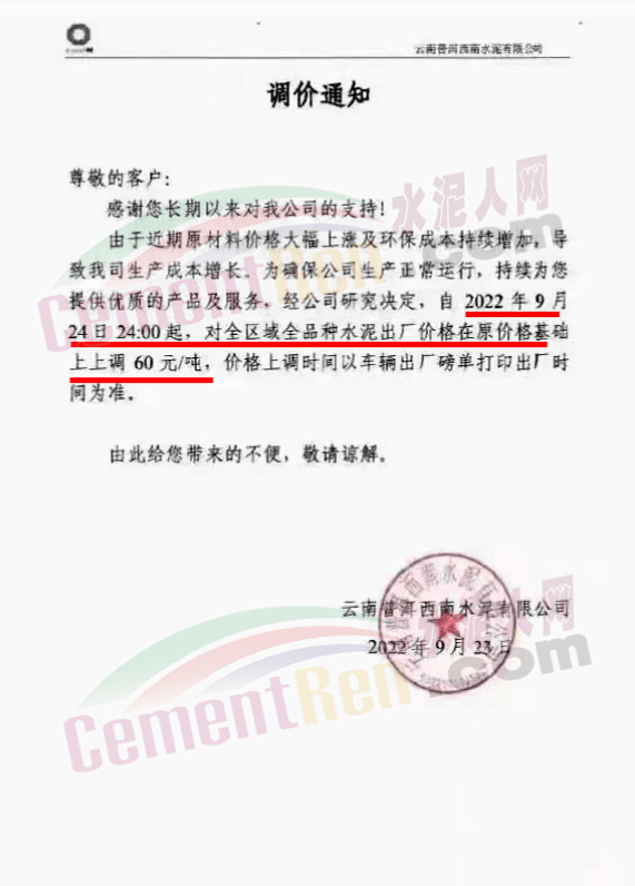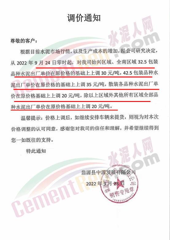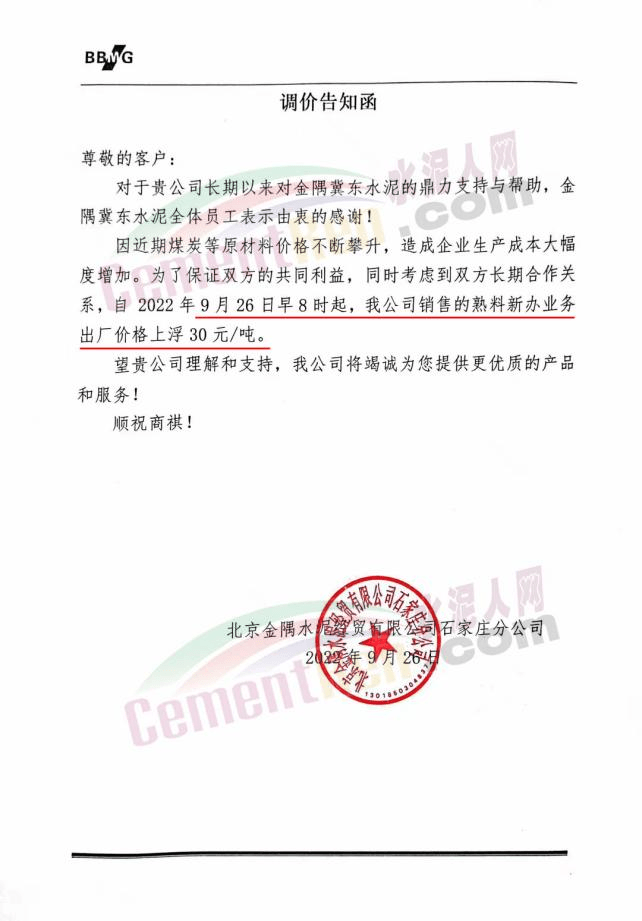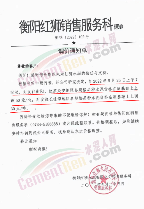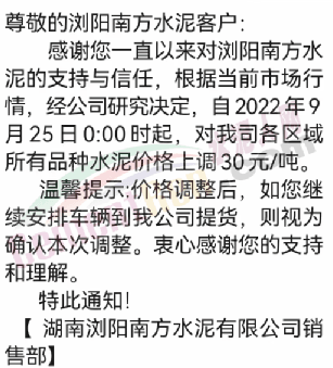 雙峰海螺水泥通知自2022年 9月26日8:00起,對(duì)各品種水泥的掛牌出廠價(jià)格上調(diào)30元/噸。