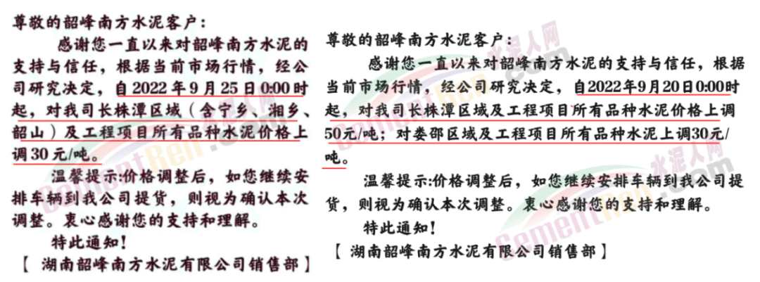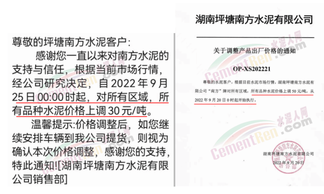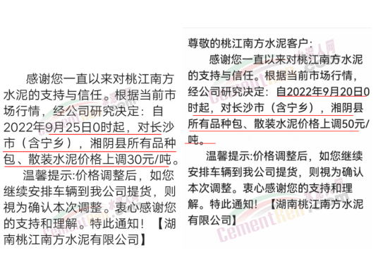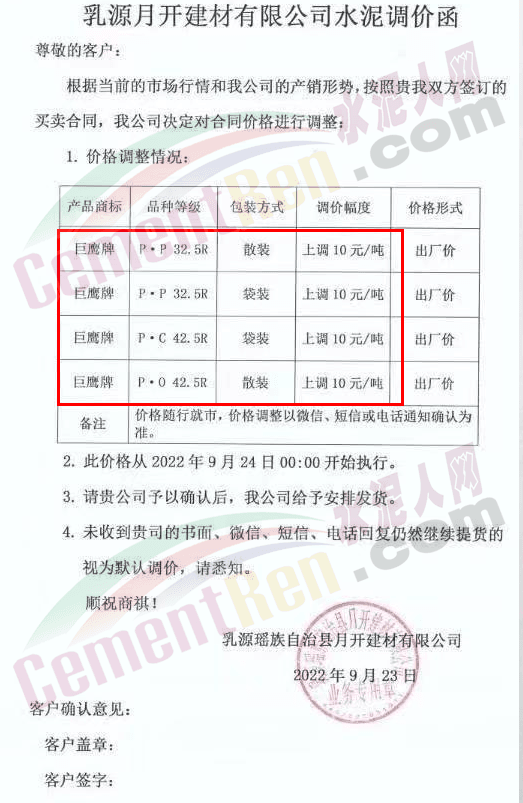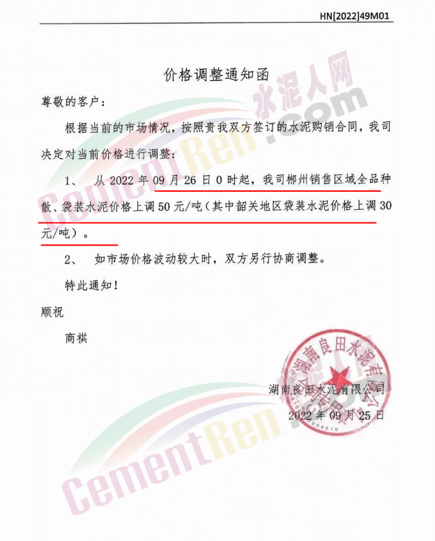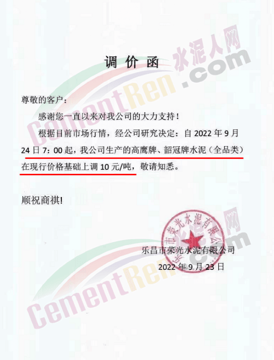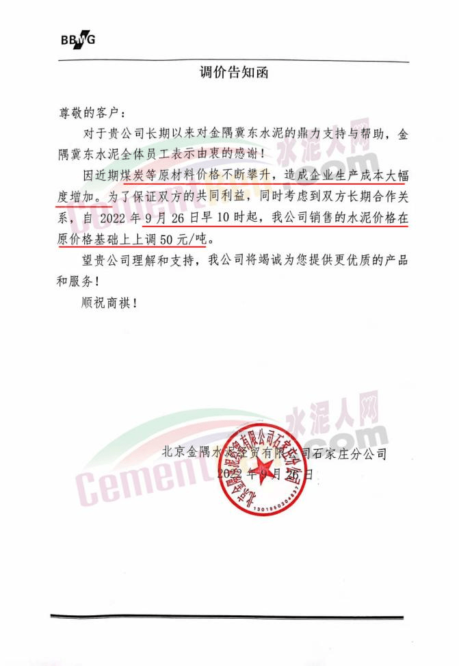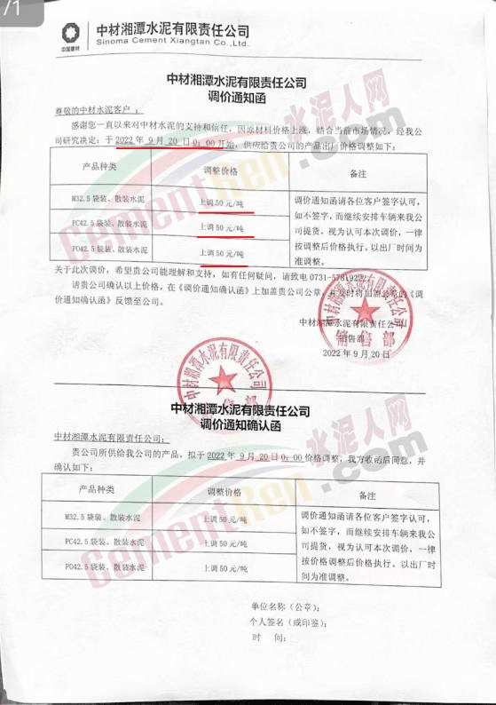 雙峰海螺水泥通知自2022年 9月26日8:00起,對(duì)各品種水泥的掛牌出廠價(jià)格上調(diào)30元/噸。