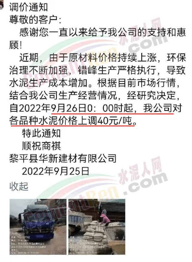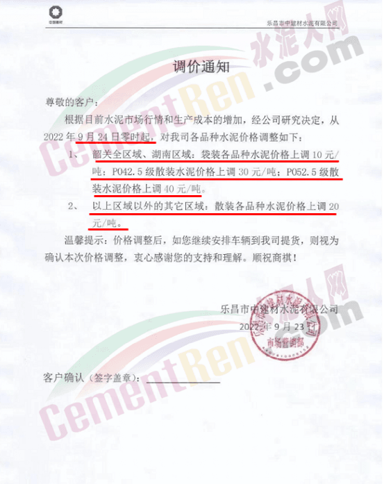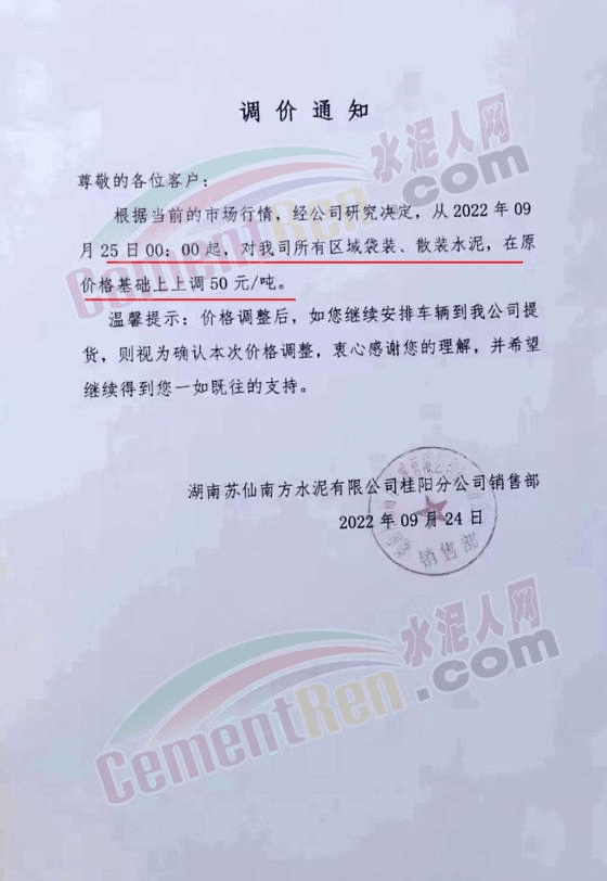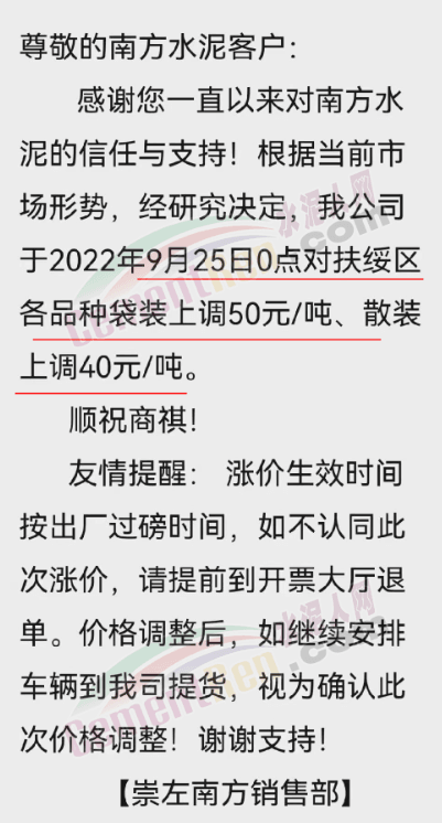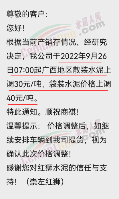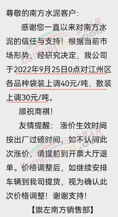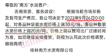 桂林南方水泥有限公司通知, 根據(jù)當(dāng)前市場形勢及我司生產(chǎn)情況,公司決定于2022年9月26日0:00起,對(duì)各品種袋裝水泥價(jià)格上調(diào)30元/噸、各品種散裝水泥價(jià)格上調(diào)20元/噸。
