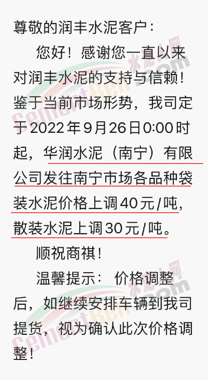 華潤水泥(南寧)公司通知,自9月26日起發(fā)往南寧市場袋裝水泥上調(diào)40元/噸,散裝水泥上調(diào)30元/噸。