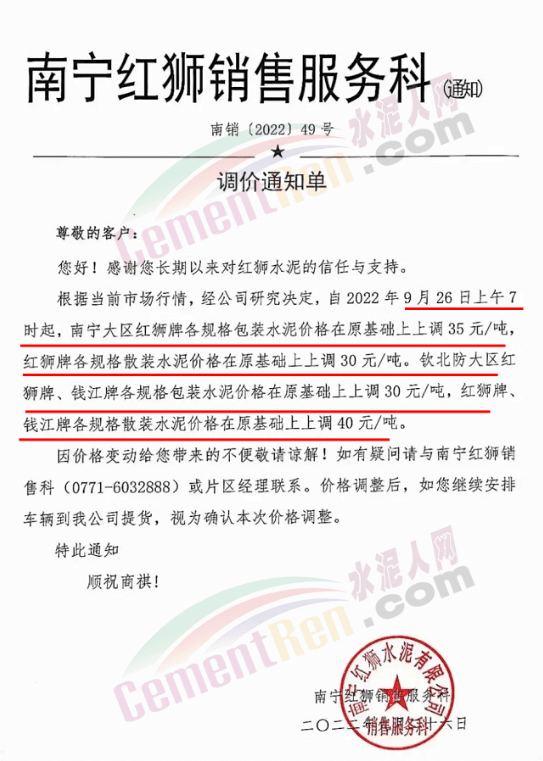 南寧紅獅水泥通知自9月26日上午7時(shí)起,水泥價(jià)格上調(diào)30-40元/噸。