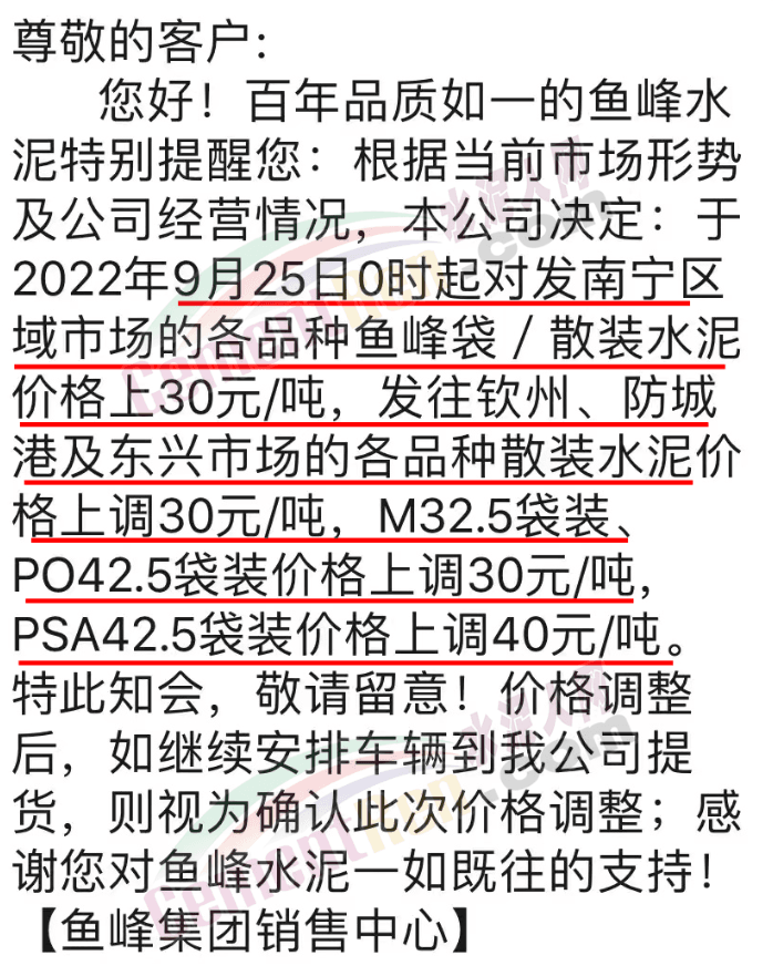 魚峰集團(tuán)銷售中心通知,自9月25日0時(shí)起對(duì)發(fā)南寧及欽州、防城港及東興市場散裝水泥價(jià)格上調(diào)30-40元/噸。