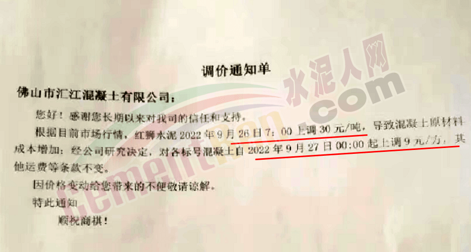 某混凝土企業(yè)通知,紅獅水泥9月26日7時(shí)上調(diào)30元/噸,企業(yè)對(duì)各標(biāo)號(hào)混凝土同步上調(diào)9元/方。