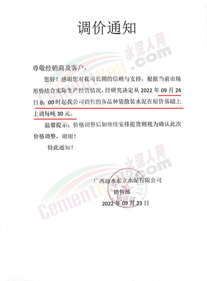 廣西融水東立水泥有限公司銷售部通知,自9月24日0時(shí)起,公司銷售的各品種水泥在原價(jià)基礎(chǔ)上上調(diào)30元/噸。