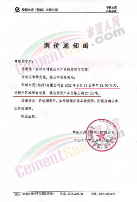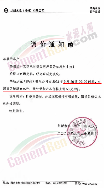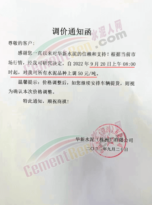 華新水泥(株洲)有限公司通知9月20日上午8時(shí)起,對(duì)公司所有水泥品牌上調(diào)50元/噸。