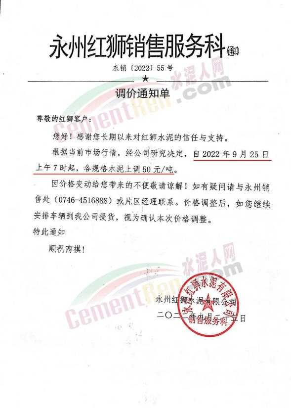 永州紅獅通知,9月25日上午7時(shí)起,各規(guī)格水泥上調(diào)50元/噸。