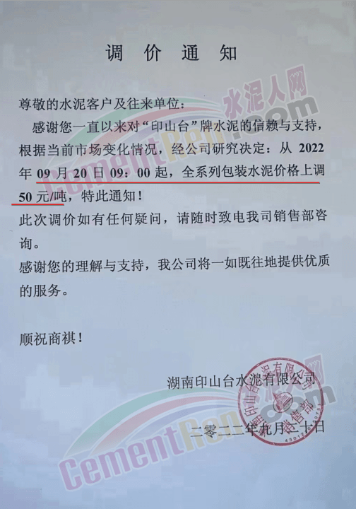 湖南印山臺(tái)水泥通知,9月20日9時(shí)起,全系列包裝水泥上調(diào)50元/噸。