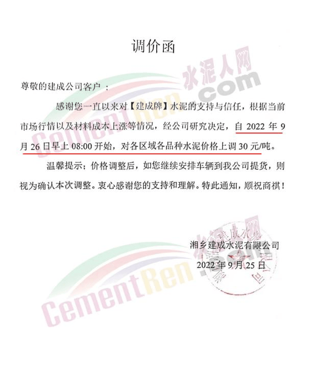 湘鄉(xiāng)建成水泥有限公司通知,9月26日早上8時(shí)起,對(duì)各區(qū)域各品種水泥價(jià)格上調(diào)30元/噸。