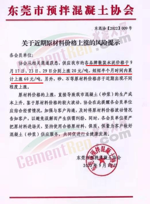 不僅佛山市商砼企業(yè)成本上漲,近期東莞市預(yù)拌混凝土協(xié)會(huì)發(fā)布《關(guān)于近期原材料價(jià)格上漲的風(fēng)險(xiǎn)提示》稱,供應(yīng)東莞市的各品牌散裝水泥價(jià)格于9 月17日、23日、29日分別上漲20元/噸,短短半個(gè)月時(shí)間內(nèi)累計(jì)上漲60元/噸。另外,砂、石等原材料價(jià)格亦于近期出現(xiàn)不同程度上漲。原材料價(jià)格上漲,直接導(dǎo)致混凝土(砂漿)的生產(chǎn)成本上升。鑒于原材料價(jià)格的較大波動(dòng),協(xié)會(huì)在此提醒各會(huì)員單位應(yīng)結(jié)合經(jīng)營情況,加強(qiáng)與客戶溝通,及時(shí)將原材料價(jià)格波動(dòng)情況告知客戶,以避免誤解而產(chǎn)生供需糾紛。