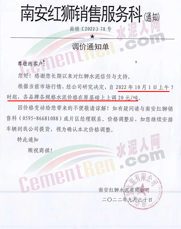 福建水泥銷售經(jīng)理通知,10月1日起所有銷售片區(qū)所有水泥品種上調(diào)20元/噸,預(yù)計(jì)10月10日將再次上調(diào)40元/噸。9月中旬、下旬福建區(qū)域分別上調(diào)10-20元/噸,累計(jì)上調(diào)20-40元/噸。