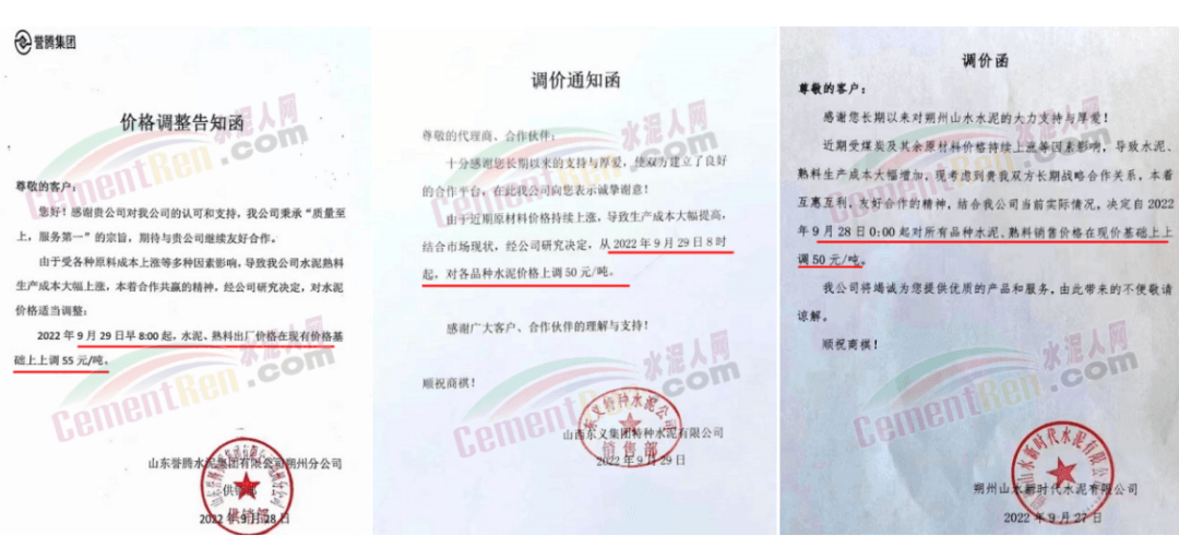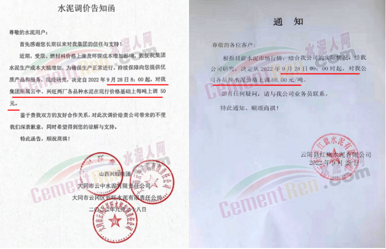 山西運(yùn)城區(qū)域9月10日前后,部分企業(yè)通知上調(diào)水泥價(jià)格20-30元/噸;9月28-29日朔州、大同區(qū)域上調(diào)50-60元/噸。
