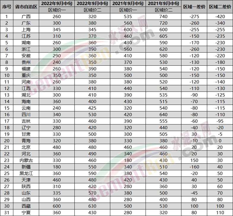 水泥人網(wǎng)信息中心數(shù)據(jù)顯示,今年二、三季度水泥價(jià)格都處于相對較低的狀態(tài),與上年9月中旬相比,廣西區(qū)域27家主要品牌企業(yè)出廠報(bào)價(jià)為260-320元/噸,均價(jià)已在300元/噸以下。上年同期廣西區(qū)域出廠價(jià)最高達(dá)740元/噸,最低也要535元/噸左右,同比價(jià)格下跌275-420元/噸。9月下旬,同比上年同期,華南廣東、廣西區(qū)域各區(qū)域參考均價(jià)與上年同比差價(jià)高達(dá)350-410元/噸。