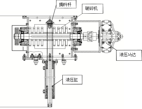 1500~2000mm,負責(zé)處理平板閘以上結(jié)拱的塊狀料甚至大塊料,中空油缸聯(lián)接羅茨風(fēng)機到減壓錐內(nèi)部可以替代部分充氣箱功能,以解決架空料的處理難題;下部在破碎機構(gòu),將溜下到破碎腔的塊狀料破碎成 2 公分左右的小塊,使得小塊能隨粉料一起被斜槽送走,解決在斜槽卸料器拐彎處堵料問題;由于本身破碎腔中自帶約 2.5 公分間隙,對正常粉料卸料沒有影響。如果發(fā)生破碎腔有堵,反而說明里面有塊狀料,這時只要開啟疏堵機,就能快速疏通。由于現(xiàn)場安裝空間所限和提供較強的破碎能力,該系統(tǒng)采用了液壓馬達,羅茨風(fēng)機,與液壓捅料機構(gòu)合起來集成為一個液壓系統(tǒng)。其設(shè)備示意圖如下: