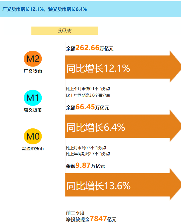 9月末,廣義貨幣(M2)余額262.66萬(wàn)億元,同比增長(zhǎng)12.1%,增速比上月末低0.1個(gè)百分點(diǎn),比上年同期高3.8個(gè)百分點(diǎn);狹義貨幣(M1)余額66.45萬(wàn)億元,同比增長(zhǎng)6.4%,增速分別比上月末和上年同期高0.3個(gè)和2.7個(gè)百分點(diǎn);流通中貨幣(M0)余額9.87萬(wàn)億元,同比增長(zhǎng)13.6%。前三季度凈投放現(xiàn)金7847億元。