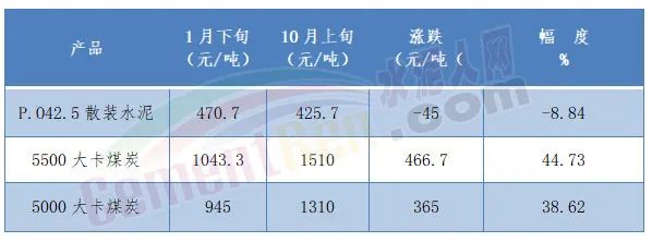 國(guó)家統(tǒng)計(jì)局?jǐn)?shù)據(jù)顯示,今年1月下旬至10月上旬 P.O42.5散裝水泥市場(chǎng)均價(jià)下跌45元/噸,跌幅為8.84%;5500大卡煤炭?jī)r(jià)格卻上漲了466.7元/噸;5000大卡煤炭?jī)r(jià)格上漲了365元/噸;漲幅分別為44.73%和38.62%。