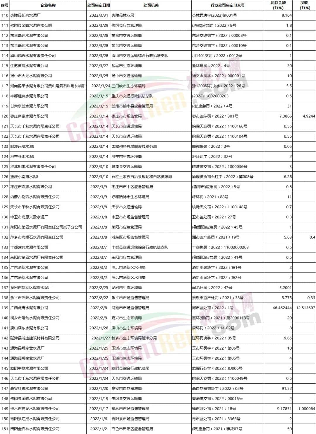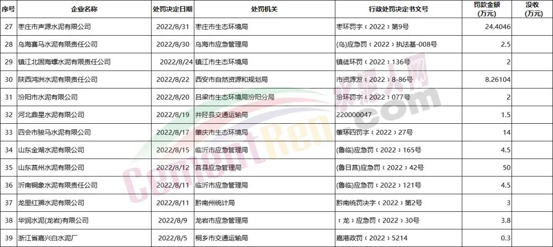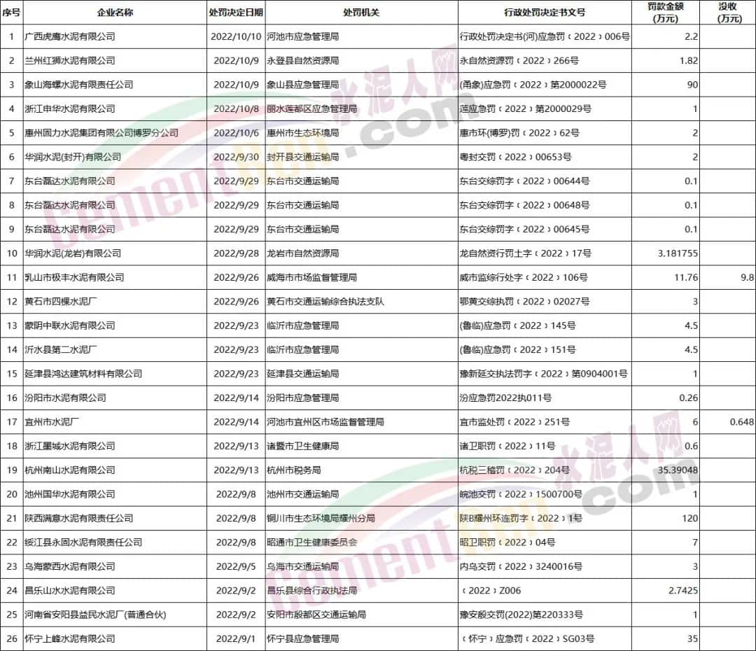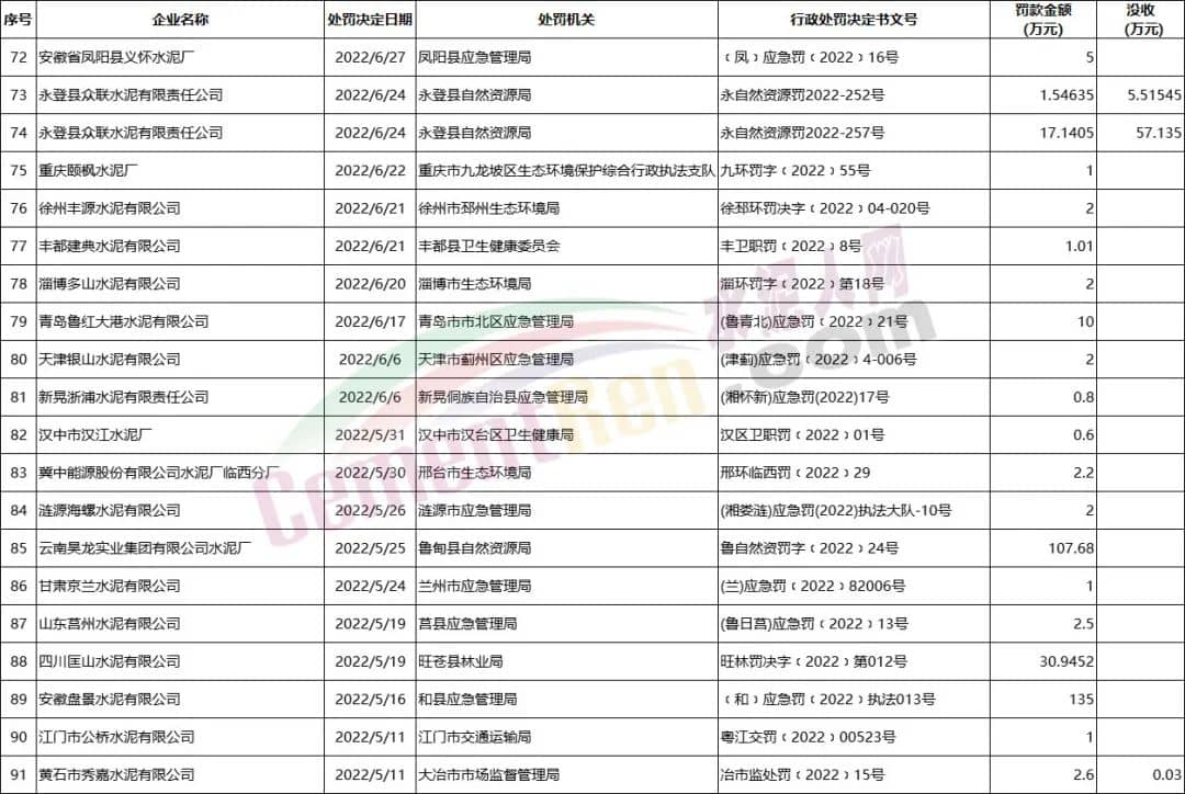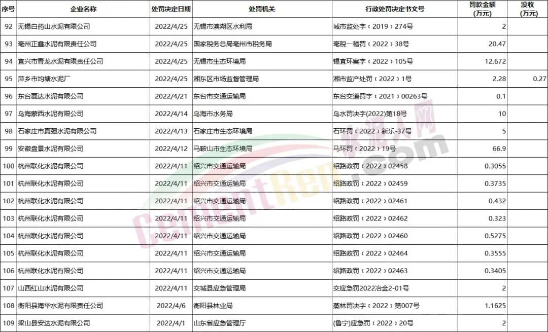 2022年1月至今部分涉及水泥企業(yè)罰沒案