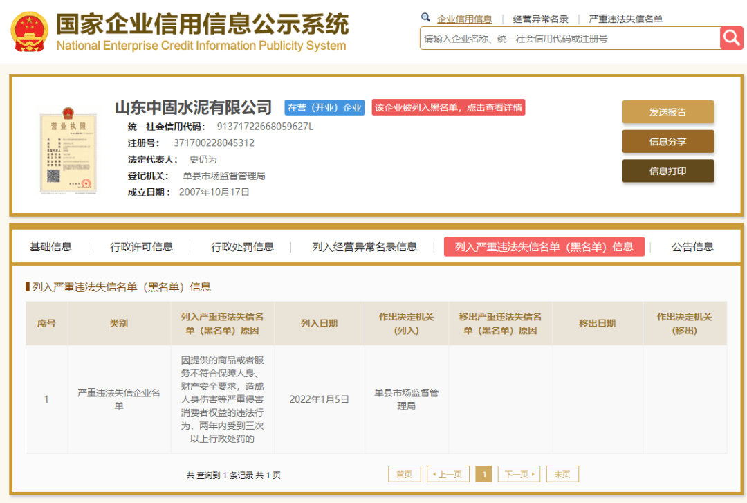 今年3月中旬,國家市場監(jiān)管總局曾集中曝光一批嚴(yán)重違法失信名單典型案例涉及食品、重要工業(yè)產(chǎn)品和知識產(chǎn)權(quán)等領(lǐng)域。其中包括山東中固水泥有限公司生產(chǎn)不合格水泥案。