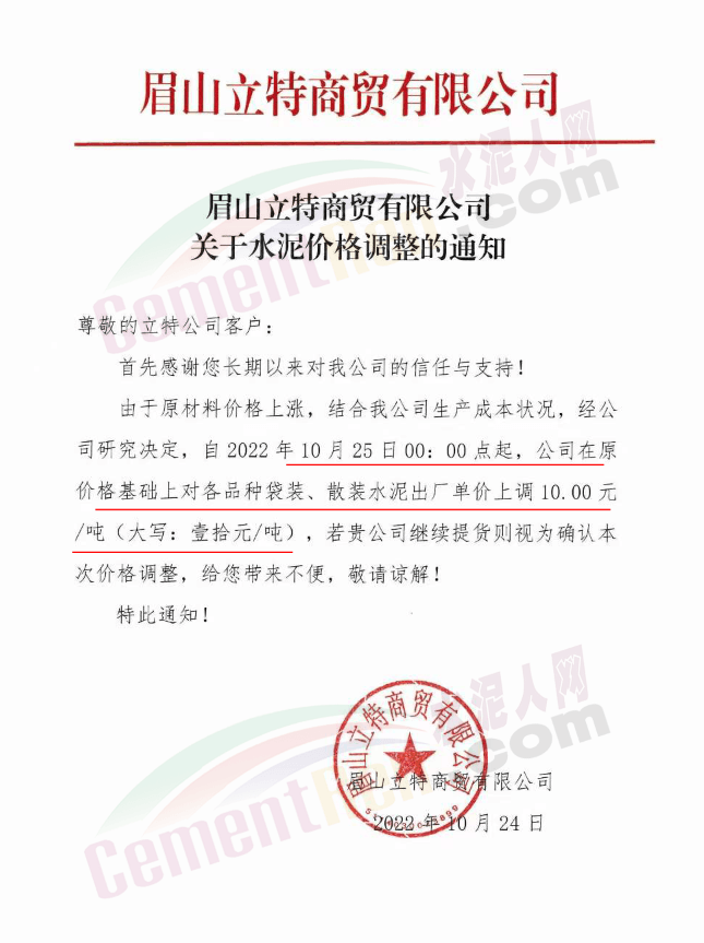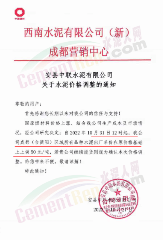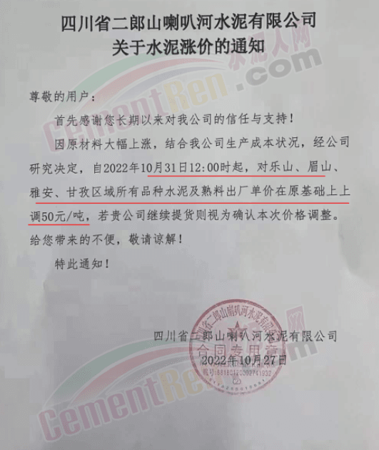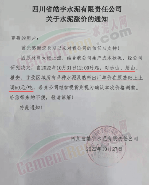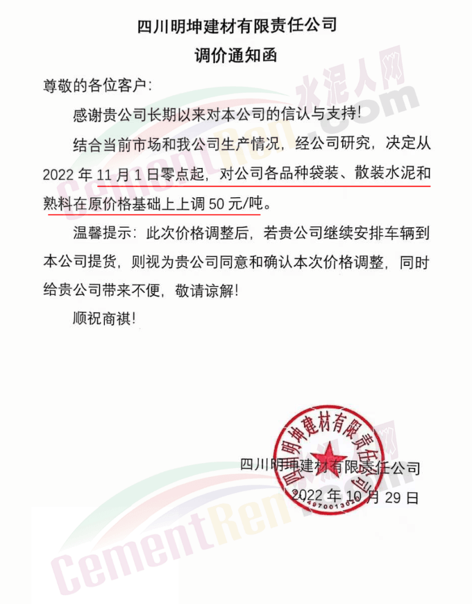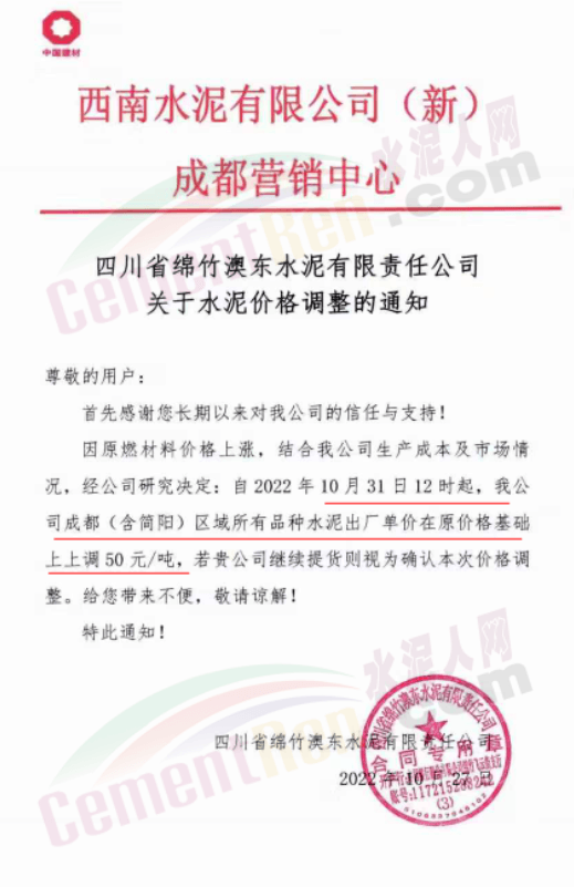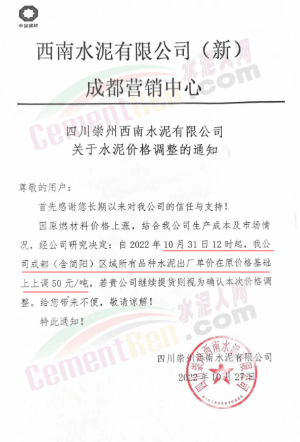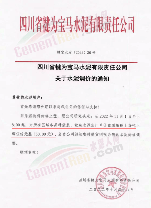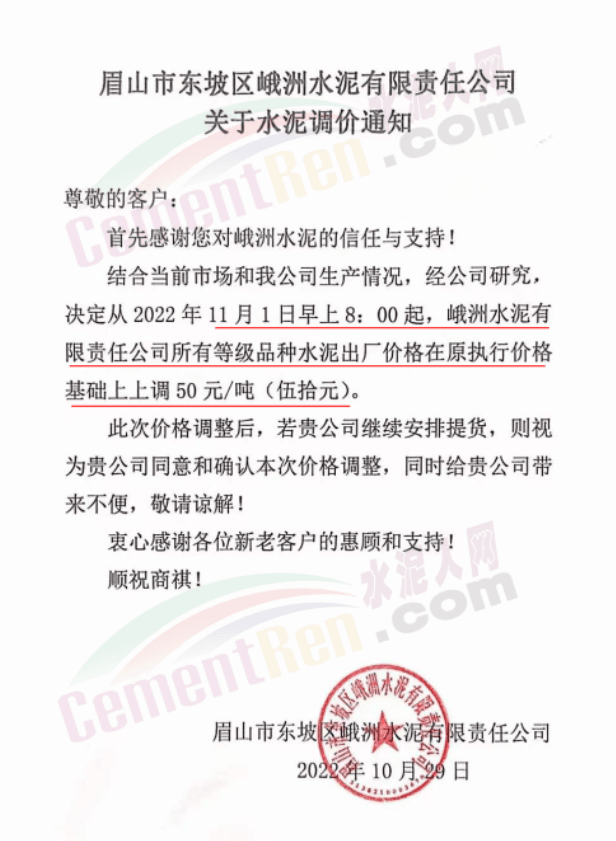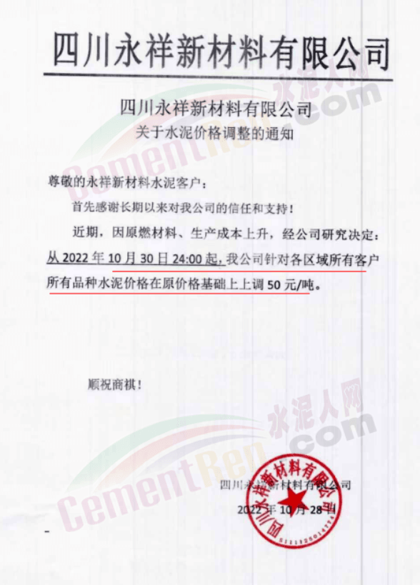 據(jù)了解,本輪調(diào)價(jià)是從10月30日起,包括粉磨站在內(nèi)的多家水泥企業(yè)通知上調(diào)水泥價(jià)格50元/噸,熟料價(jià)格同步上調(diào)30元/噸。