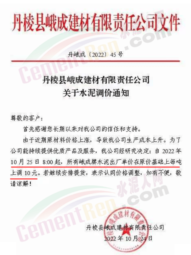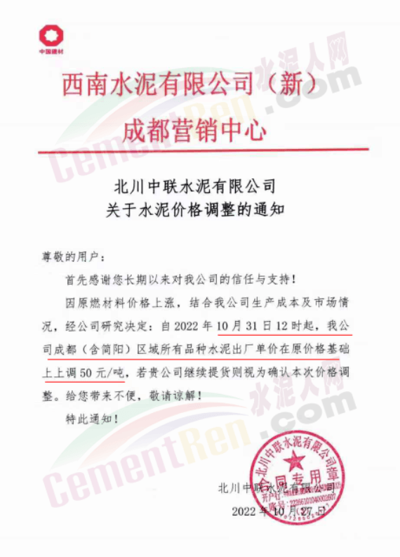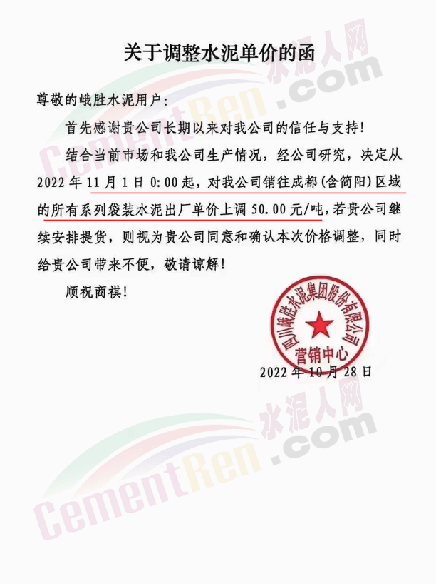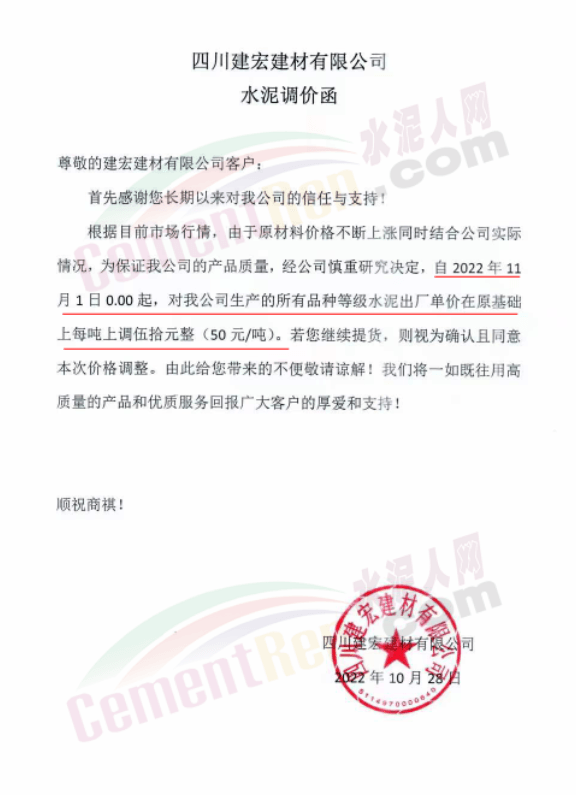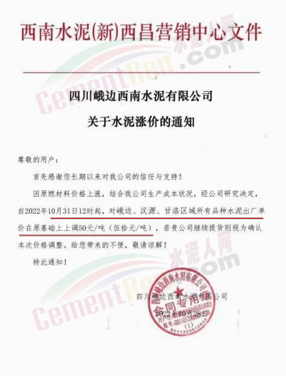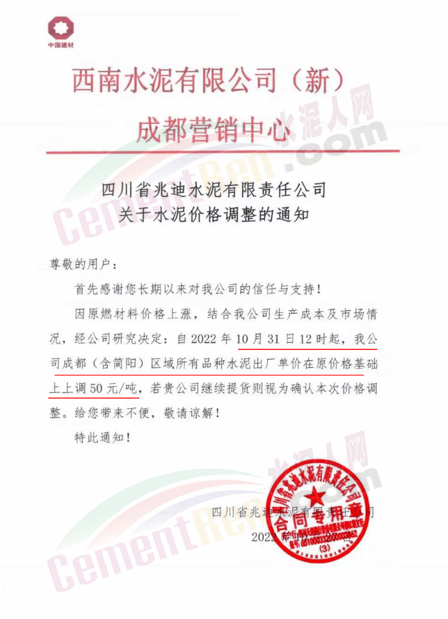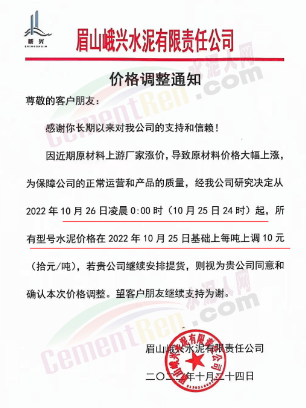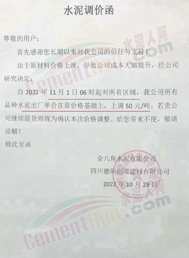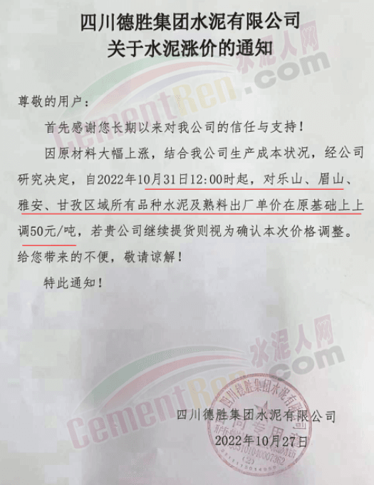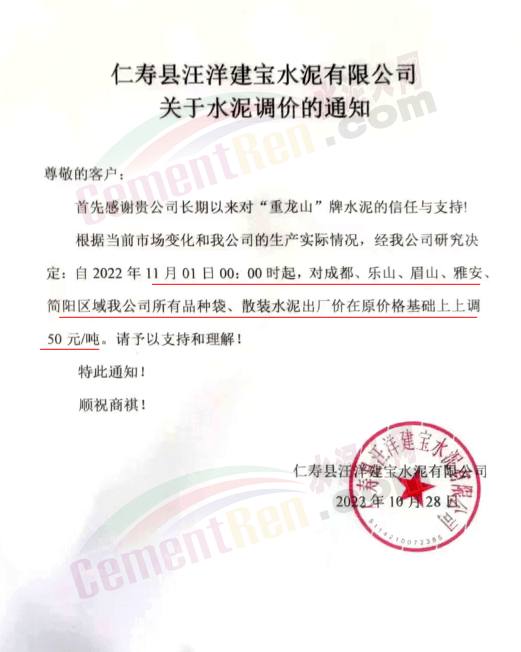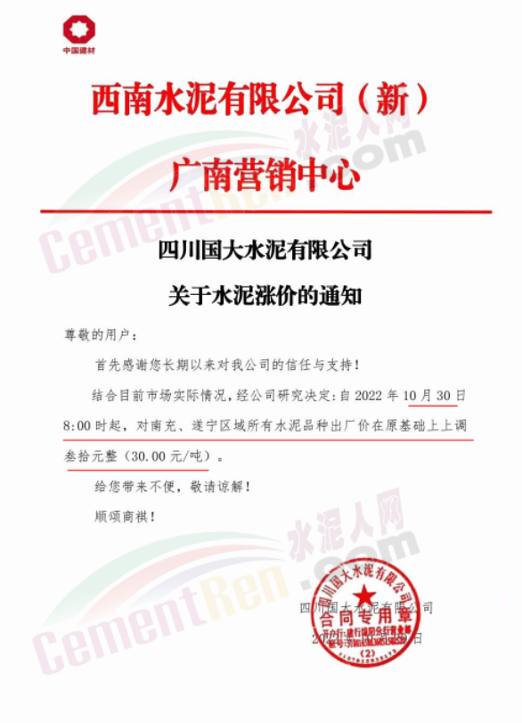 據(jù)了解,本輪調(diào)價(jià)是從10月30日起,包括粉磨站在內(nèi)的多家水泥企業(yè)通知上調(diào)水泥價(jià)格50元/噸,熟料價(jià)格同步上調(diào)30元/噸。